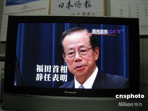 9月1日晚9时30分,日本首相福田康夫在首相官邸举行记者会见,向国民表明决定辞职。图为日本电视台直播福田首相决定辞职的记者会。福田康夫2007年9月26日接替安倍晋三担任首相,在任期不满一年。 中新社发 段跃中 摄
