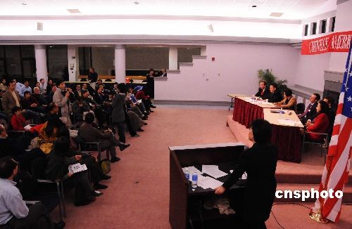 当地时间十月二十八日晚,两党竞选阵营代表在此间和美籍华人社区领袖举行特别会议,就两党的竞选政策回答了华裔选民关注的问题。图为民主共和两党竞选阵营代表和华裔选民交流。中新社发 邱江波 摄