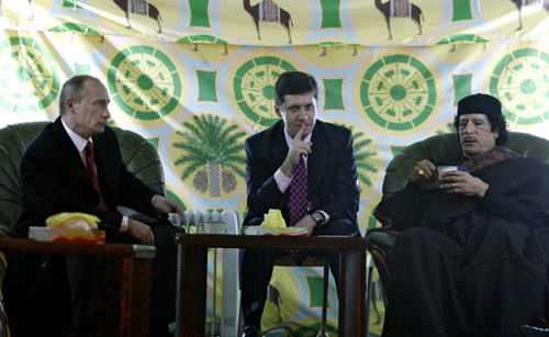 11月1日,俄罗斯总理普京来到利比亚领导人卡扎菲搭建在莫斯科克里姆林宫的贝都因人帐篷内会见卡扎菲。