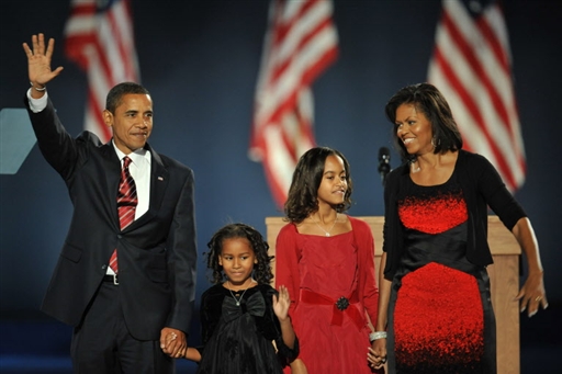 美国总统大选投票结果陆续出炉,奥巴马笃定当选下届美国总统。他发表以“美国的变革”为主题的获胜演说。图为白宫新主人奥巴马和家人向大家招手致意。