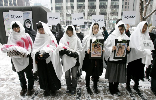 1月16日,韩国一些民众聚集在首尔以色列使馆前进行示威,几位妇女手举象征在战火中丧生的儿童照片和玩偶,抗议以色列袭击加沙。