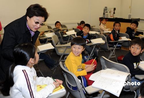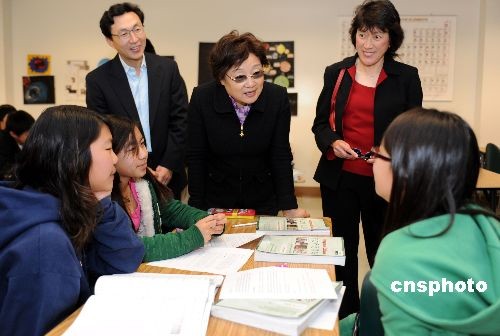 当地时间二月八日,中国国务院侨办主任李海峰(中)来到美国加州圣地亚哥华夏中文学校参观访问,并与学生进行面对面交流,了解他们的家庭语言环境和中文学习进展。据了解,从今年开始,国侨办将在海外遴选一批“华文教育示范学校”,并在教材、师资等方面提供帮助与扶持。中新社发 张炜 摄