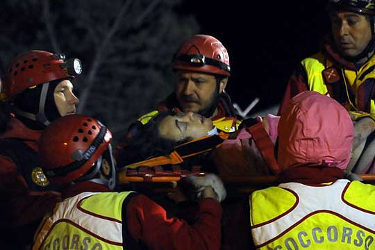 4月7日,在意大利阿布鲁佐区首府拉奎拉市,在地震废墟中被埋了20个小时后获救的一名女子被送往医院救治。