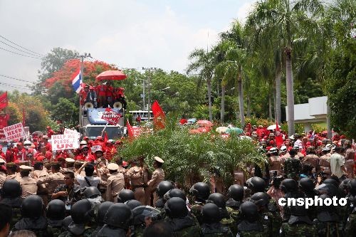 四月十日中午,两千多名泰国反独裁民主联盟红衫军聚集在帕塔亚东亚领导人系列会议中心门口进行示威抗议活动,泰国警方派出大批人员维持秩序。东亚领导人系列会议定于4月10日至12日在泰国帕塔亚市举行。中新社发 顾时宏 摄