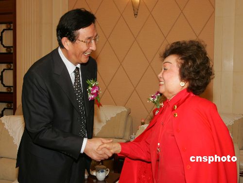 九月五日,上海市委书记陈良宇(左)在上海展览中心会见海外华商代表、美国国际合作委员会主席陈香梅等。在上海开幕的“第三届华商企业科技创新合作交流会”云集了海内外四十多个国家和地区的四百多位华商领袖、代表和著名学者与会。中新社发 潘索菲 摄