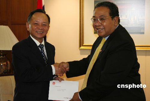 十月四日上午,中国驻泰王国大使张九桓将温家宝总理致泰国总理素拉育的贺电亲手交给泰国代理外交部长格里。温家宝在贺电中说,欣悉素拉育阁下出任泰王国总理,谨代表中国政府并以他个人名义,向阁下致以诚挚的祝贺和良好的祝愿。祝泰王国繁荣昌盛,人民幸福。中新社发 顾时宏 摄