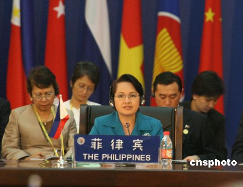 十月三十日下午,中国—东盟建立对话关系十五周年纪念峰会开幕。图为东盟轮值主席国菲律宾总统阿罗约在会上作主题发言。中新社发 蒋雪林 摄