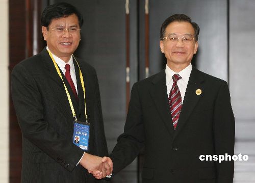 十月三十日,中国—东盟建立对话关系十五周年纪念峰会在广西南宁荔园山庄国际会议中心开幕。图为中国国务院总理温家宝欢迎老挝总理波松与会。中新社发 廖文静 摄