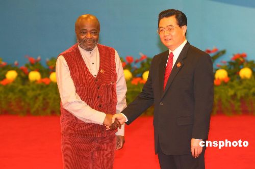 11月4日,中非合作论坛北京峰会在北京人民大会堂开幕。中国国家主席胡锦涛在大会开幕前迎接刚果(金)副总统耶罗迪亚。中新社发 盛佳鹏 摄