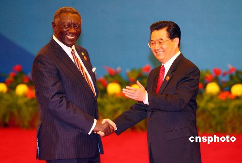 11月4日,中非合作论坛北京峰会在北京人民大会堂开幕。中国国家主席胡锦涛在大会开幕前迎接加纳总统库福尔。中新社发 盛佳鹏 摄