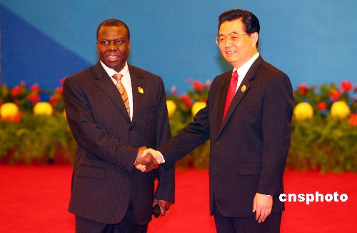 11月4日,中非合作论坛北京峰会在北京人民大会堂开幕。中国国家主席胡锦涛在大会开幕前迎接几内亚比绍总统维埃拉。中新社发 盛佳鹏 摄