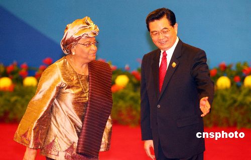 11月4日,中非合作论坛北京峰会在北京人民大会堂开幕。中国国家主席胡锦涛在大会开幕前迎接利比里亚总统瑟利夫。中新社发 盛佳鹏 摄
