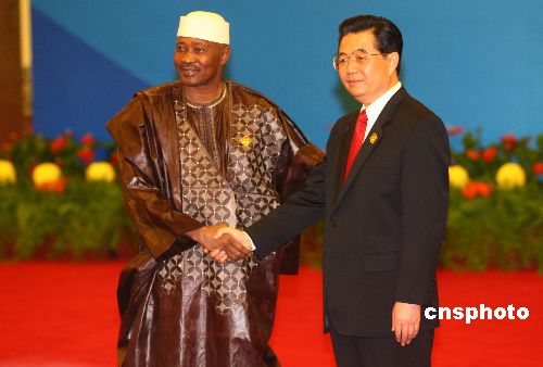 11月4日,中非合作论坛北京峰会在北京人民大会堂开幕。中国国家主席胡锦涛在大会开幕前迎接马里总统杜尔。中新社发 盛佳鹏 摄