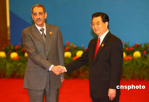 11月4日,中非合作论坛北京峰会在北京人民大会堂开幕。中国国家主席胡锦涛在大会开幕前迎接毛里塔尼亚军事委员会主席瓦尔。中新社发 盛佳鹏 摄