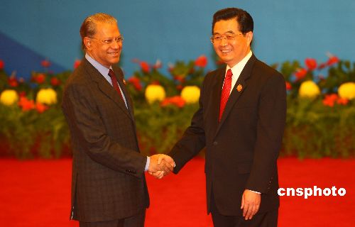 11月4日,中非合作论坛北京峰会在北京人民大会堂开幕。中国国家主席胡锦涛在大会开幕前迎接毛里求斯总理纳文。中新社发 盛佳鹏 摄