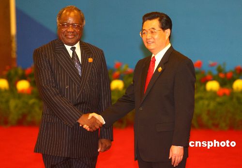 11月4日,中非合作论坛北京峰会在北京人民大会堂开幕。中国国家主席胡锦涛在大会开幕前迎接纳米比亚总统波汉巴。中新社发 盛佳鹏 摄