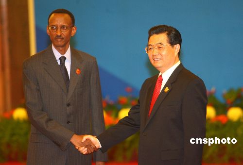 11月4日,中非合作论坛北京峰会在北京人民大会堂开幕。中国国家主席胡锦涛在大会开幕前迎接卢旺达总统卡加梅。中新社发 盛佳鹏 摄