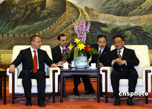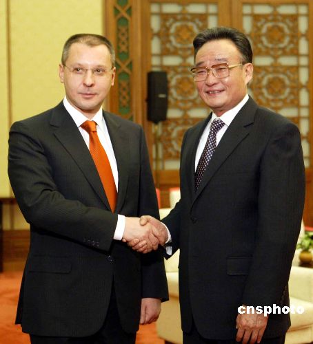 十一月二十一日,中国全国人大常委会委员长吴邦国,在北京人民大会堂会见来华访问的保加利亚总理斯塔尼舍夫。中新社发 任海霞 摄