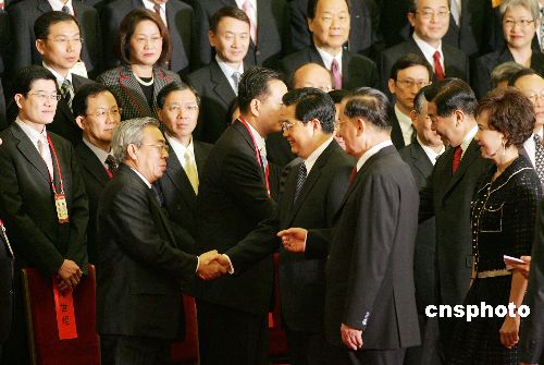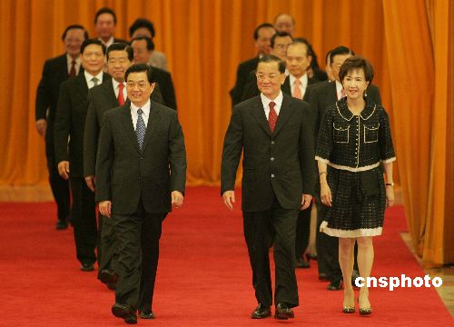 四月二十八日,中共中央总书记、国家主席胡锦涛在北京人民大会堂会见中国国民党荣誉主席连战等出席第三届两岸经贸文化论坛的嘉宾,并同全体与会代表一起合影。中新社发 毛建军 摄