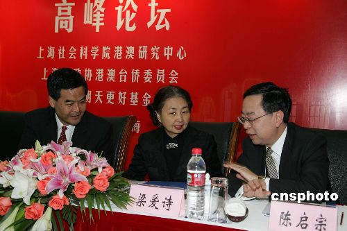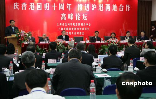 六月一日,“庆香港回归十周年、推进沪港两地合作”高峰论坛在上海举行。香港特区政府行政会议召集人梁振英、香港基本法委员会副主任、原香港特区政府律政司司长梁爱诗等出席会议。峰会同时吸引了上海、香港、深圳等地的一百多位政府官员、企业家、专家学者聚集一堂,他们从不同的视角,对“一国两制”的伟大构想与成功实践,香港与内地经贸关系中的沪港合作,以及沪港合作十年回顾与展望等相关问题进行了深入的研讨。中新社发 潘索菲 摄