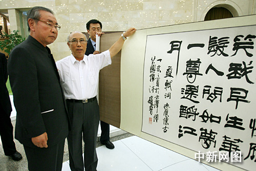 八月一日晚,《中国新闻周刊》日文版创刊纪念酒会在人民大会堂澳门厅举行,著名书法家赵普先生向日本前首相羽田孜先生赠送了书法作品。作者:刘震