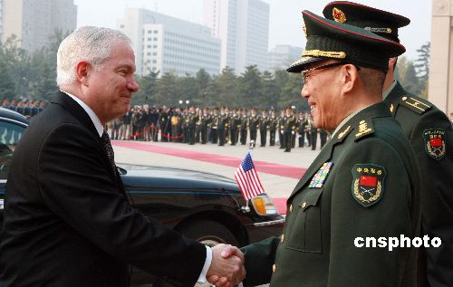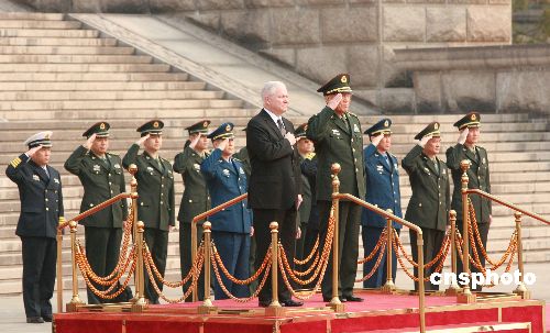 十一月五日,中华人民共和国中央军委副主席、国务委员兼国防部长曹刚川在北京举行仪式欢迎美国国防部长罗伯特·盖茨访华。中新社发 廖文静 摄