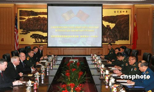 十一月五日,中华人民共和国中央军委副主席、国务委员兼国防部长曹刚川在北京与美国国防部长罗伯特·盖茨举行会谈。中新社发 廖文静 摄