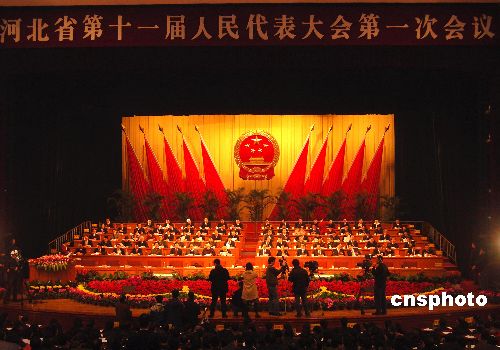 一月二十三日上午九点,河北省十一届人大一次会议在河北省会石家庄河北会堂开幕,河北省省长郭庚茂做政府工作报告。本届大会将进行换届选举,河北省第十一届人大常委会主任、副主任、秘书长、委员,河北省人民政府省长、副省长,河北省高级人民法院院长以及河北省人民检察院检察长等,将在会上选举产生。会议将于一月二十九日闭幕。中新社发 牛琳 摄