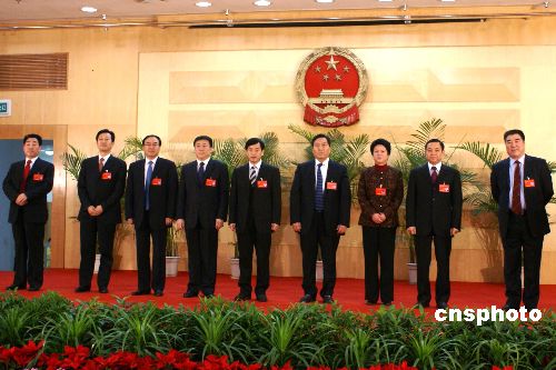 一月二十三日下午,当选河南省新一届政府省长、副省长与媒体见面。从右至左为李成玉、李克、孔玉芳、史济春、秦玉海、张大卫、徐济超、宋璇涛、刘满仓。中新社发 史宝银 摄