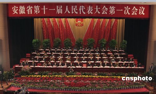 1月25日上午9时,安徽省第十一届人民代表大会第一次会议在安徽大剧院隆重开幕。此次会议将听取安徽省政府工作报告、审查计划报告和预算报告,并表决全国人大代表选举办法草案、表决总监票人和监票人名单草案、表决关于确定省十一届人大委员会组成人员名额的决定草案、表决关于设立安徽省十一届人大专门委员会的决定草案。中新社发 张娅子 摄
