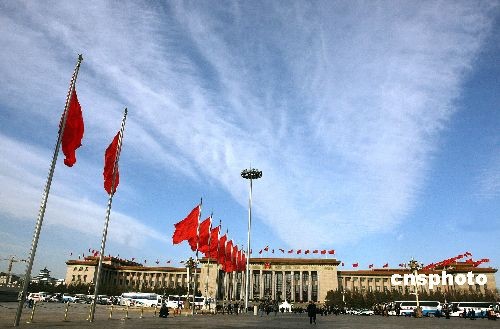 3月9日上午,北京人民大会堂上空衬托着蓝天祥云。当日,十一届全国人大二次会议第二次全体会议在北京人民大会堂举行。中新社发 任晨鸣 摄