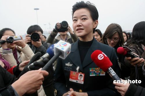 3月12日,全国政协十一届二次会议闭幕。图为政协委员宋祖英出席闭幕会后被记者包围采访。中新社发 金立冬 摄