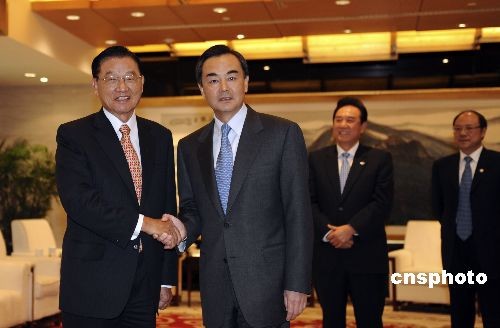 4月26日,中共中央台办主任王毅在南京会见海基会董事长江丙坤率领的协商代表团一行。中新社发 廖攀 摄