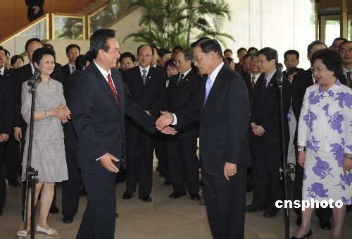 4月27日,陈云林在南京金陵饭店送别江丙坤。江丙坤离开南京后将前往扬州、苏州等地走访。中新社发 廖攀 摄