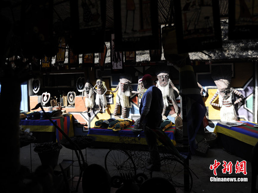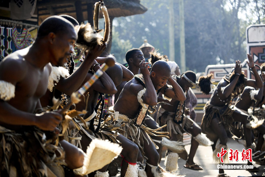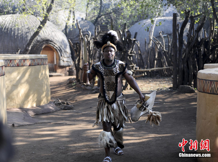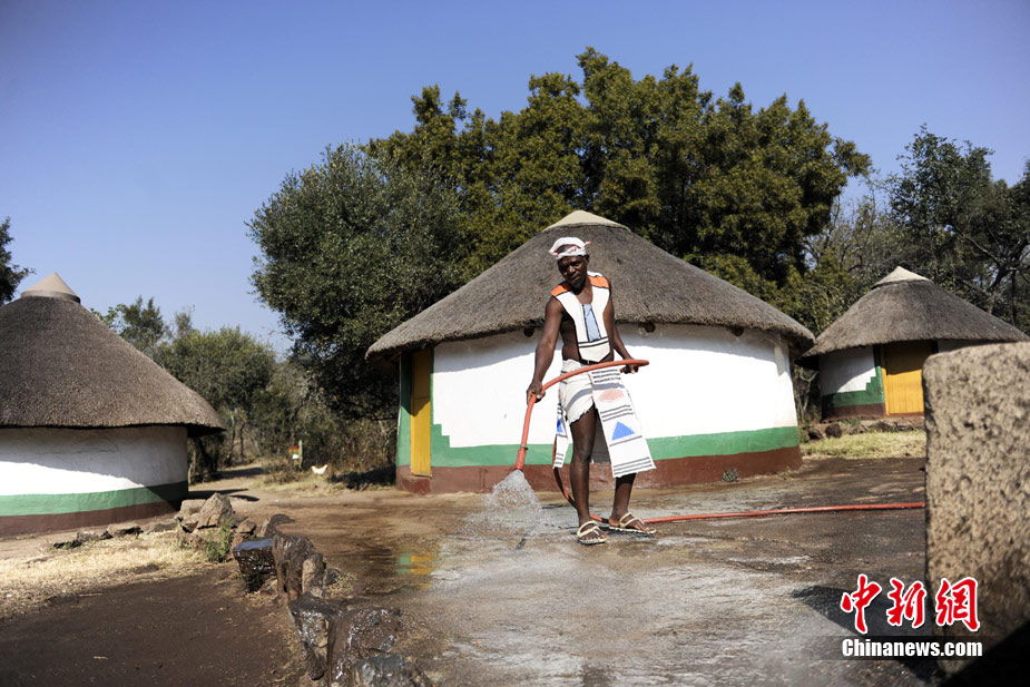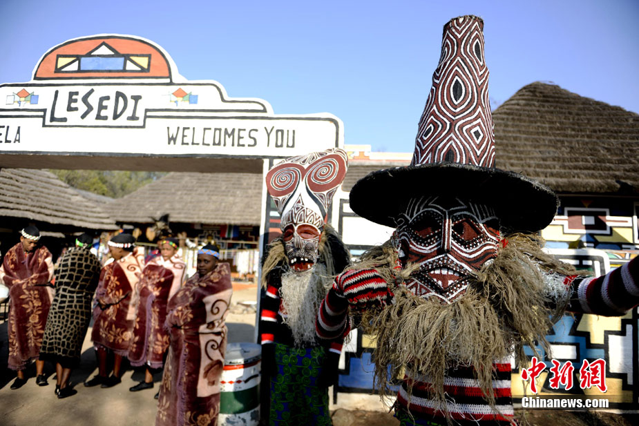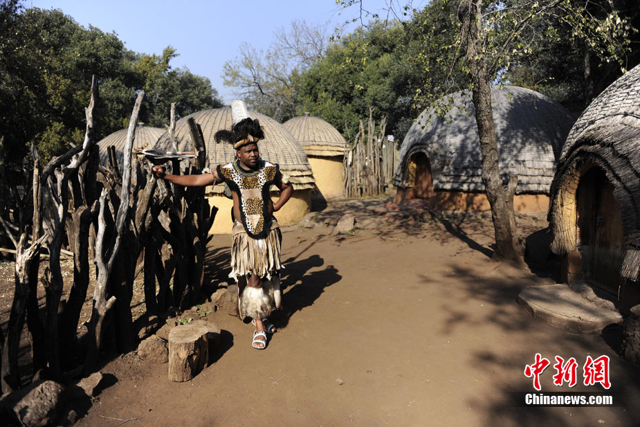 在南非约堡郊外,号称“南非文化窗口”的莱赛迪(Lesedi)民俗村,聚居着南非最重要的四个部落。这里有着非洲土著餐饮,还有着原生态的舞蹈表演,当客人来访,村民就会盛装在村口迎接。图为莱赛迪民俗村。 中新社记者 廖攀摄