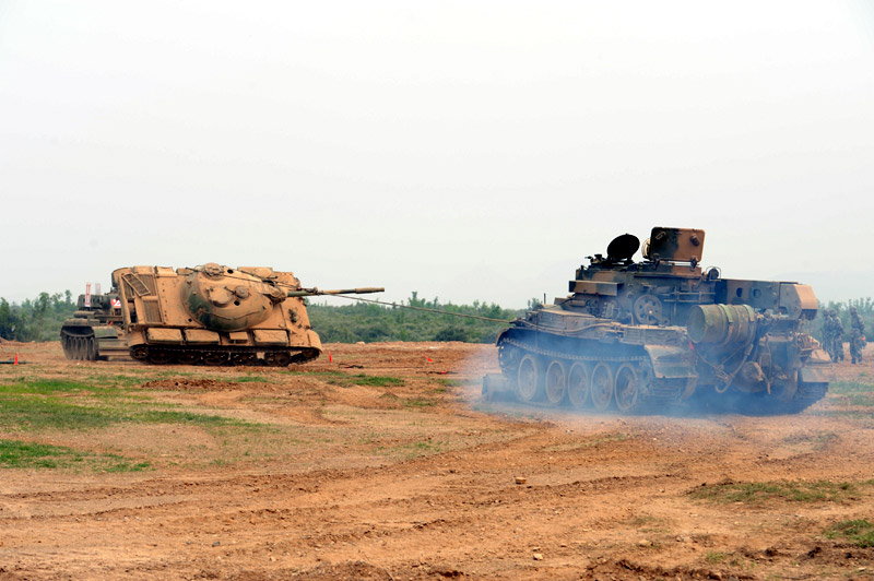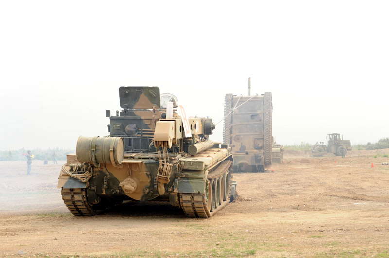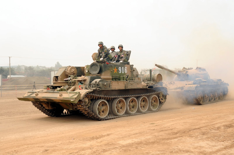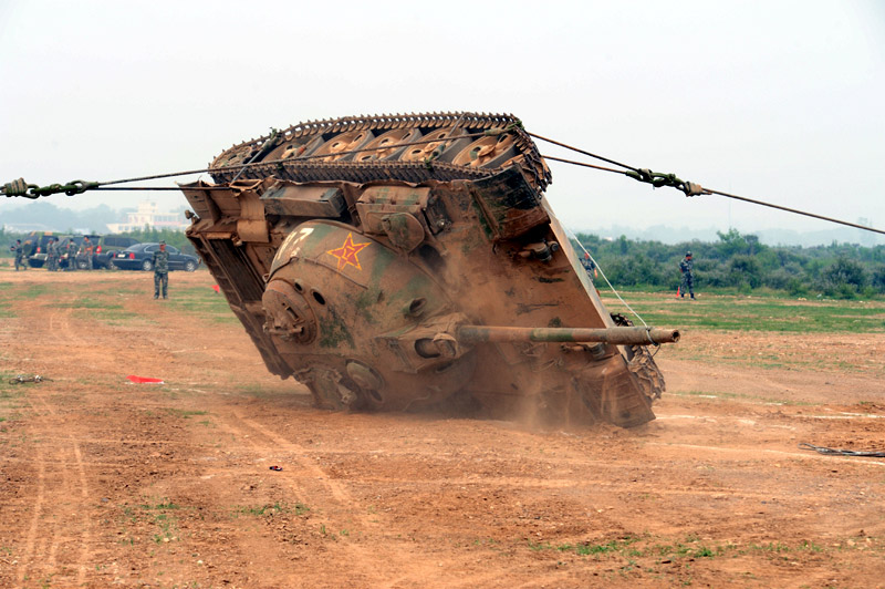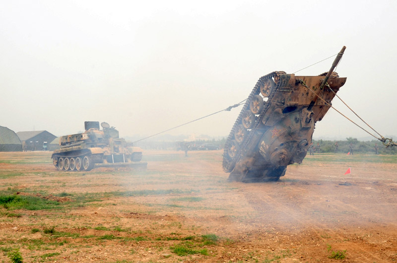 6月29日,北京军区基础比武进入第二天,装甲抢救车牵引训练坦克驶入比武现场。图片来源:新华网 高航 摄