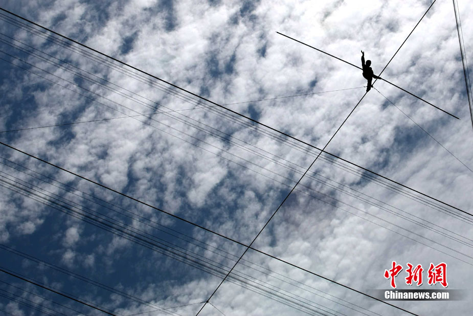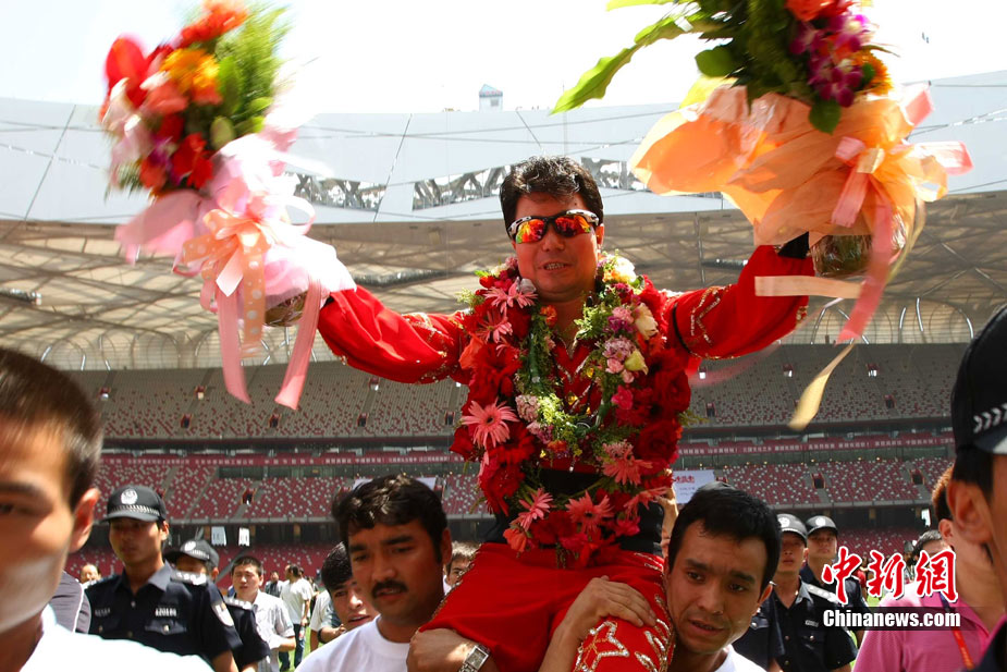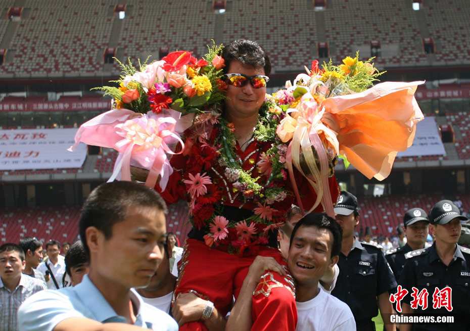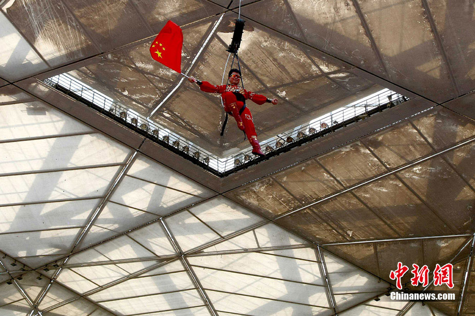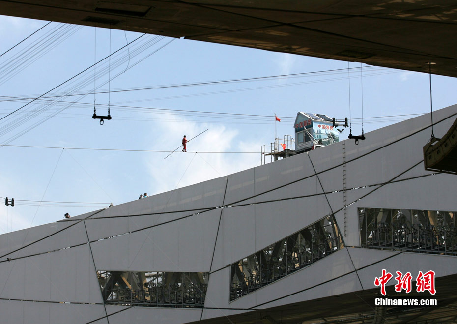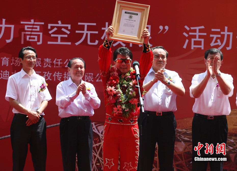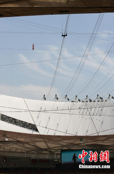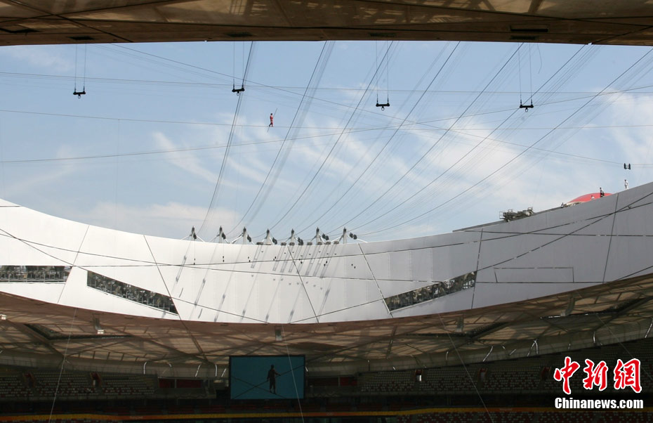 7月2日,在鸟巢上空艰难生活60天之后,高空王子阿迪力告别鸟巢回到地面,同时创造了60天累计连续走纲丝时间最长吉尼斯世界纪录。图为阿迪力用吊威亚的方式回到地面。中新社发 富田 摄