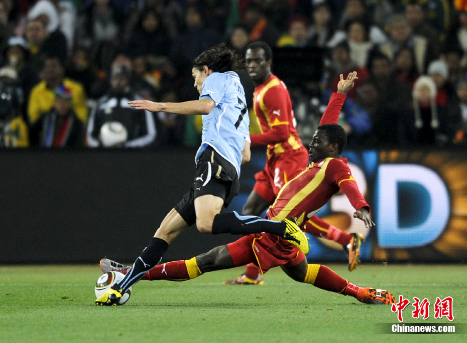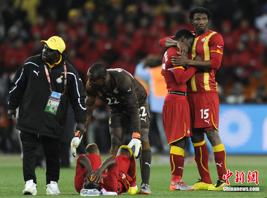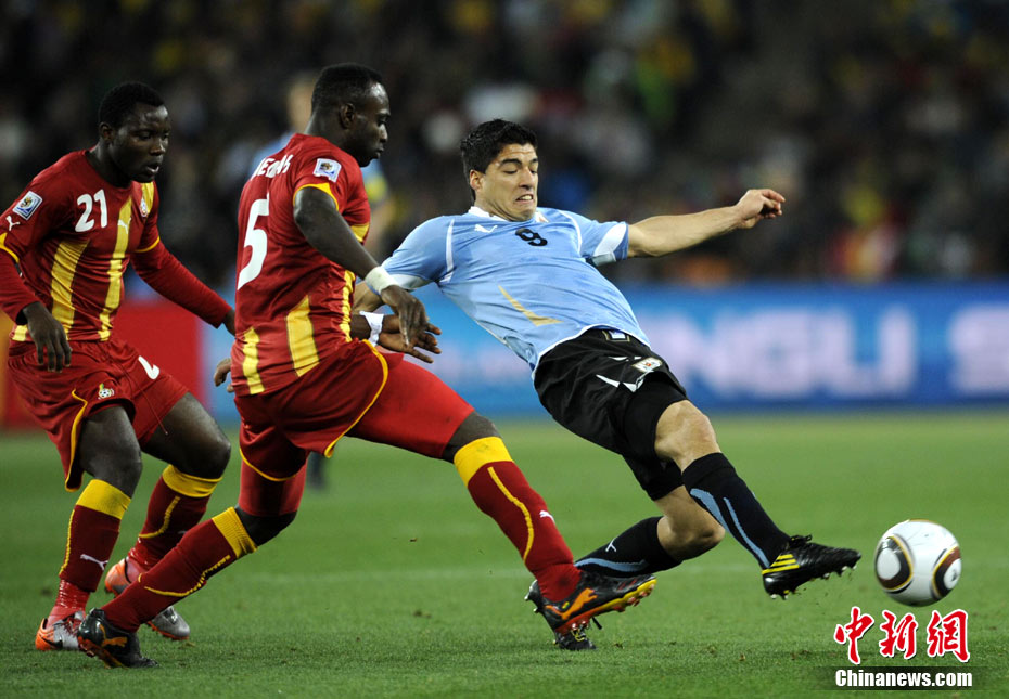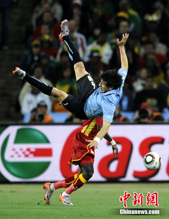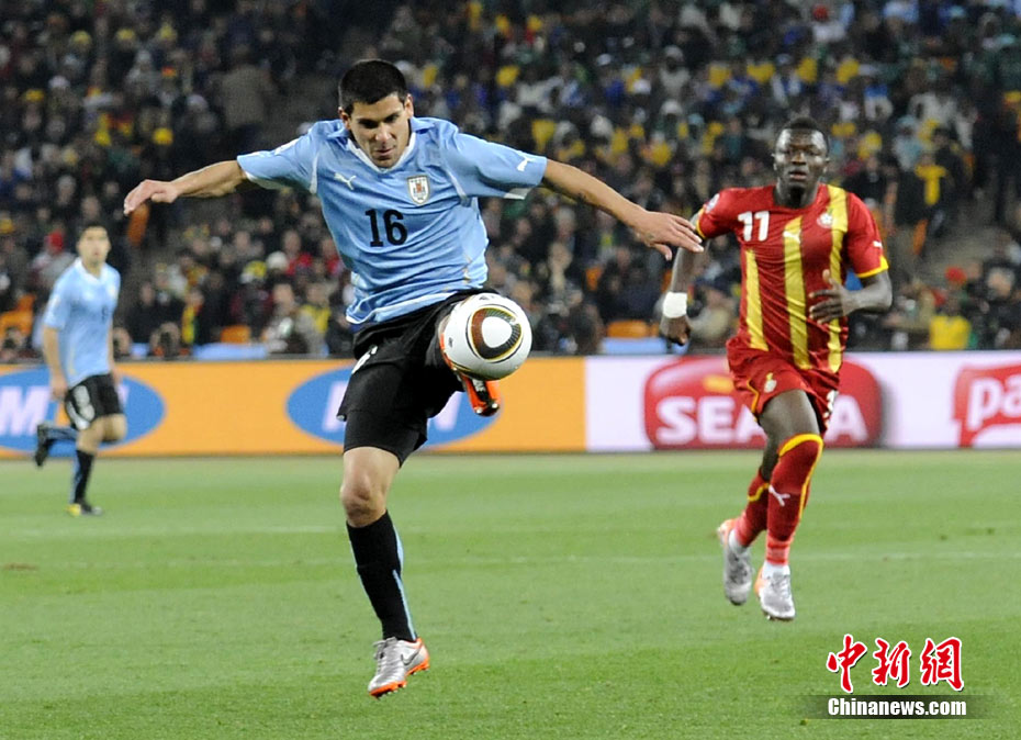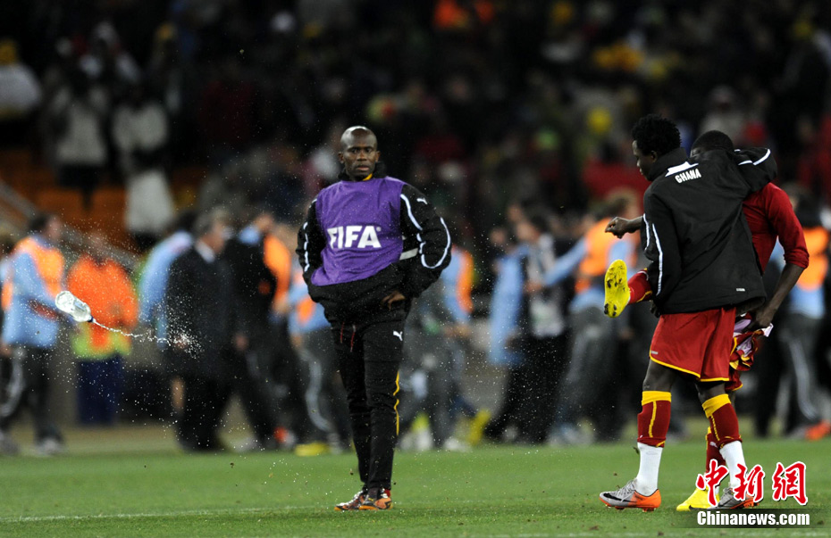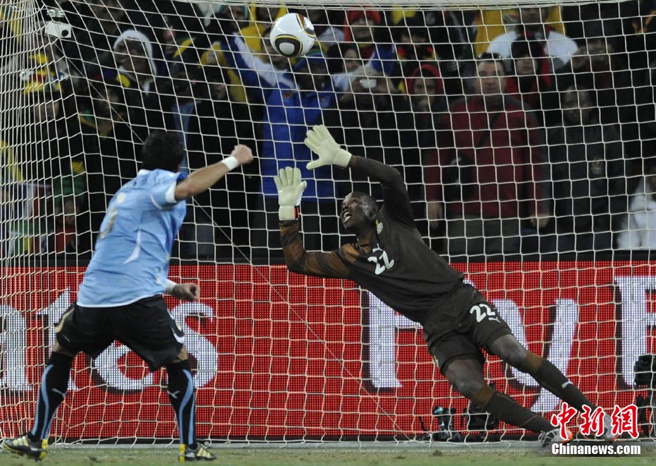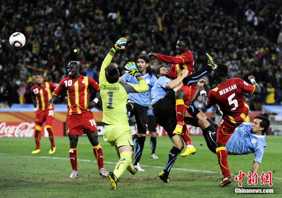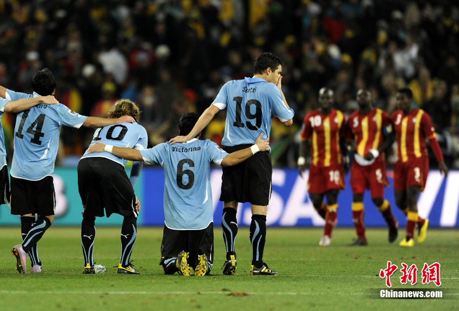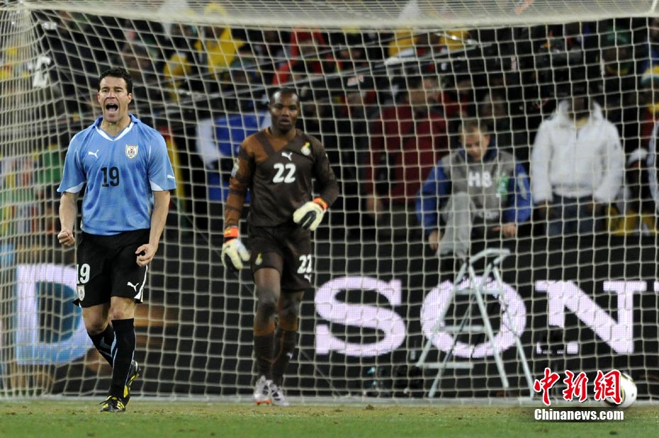 北京时间7月3日凌晨2:30,南非世界杯进行了1/4决赛的第二场争夺,由乌拉圭在约翰内斯堡的足球城球场迎战加纳队。120分钟时间内,双方凭借弗兰和蒙塔里的进球,1-1战成平局。在点球大战中,乌拉圭4-2击败对手,晋级半决赛。 中新社记者 廖攀 摄