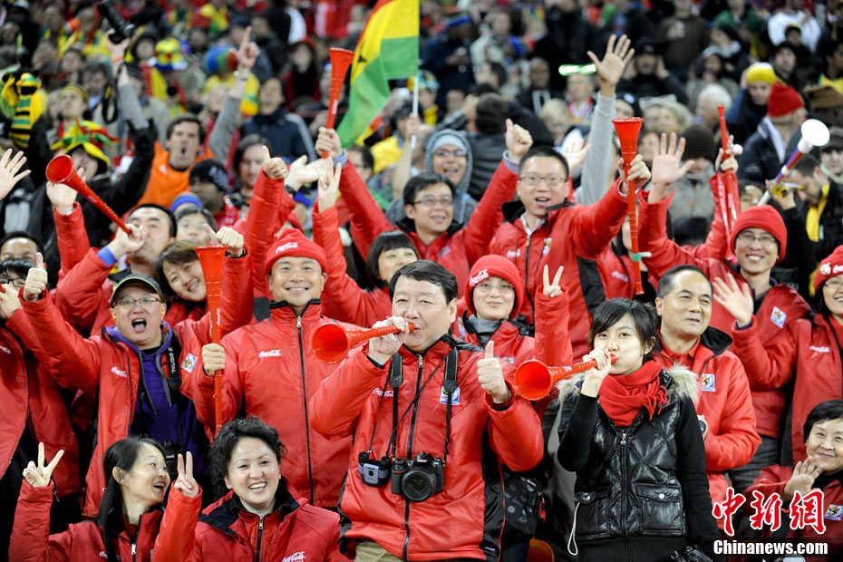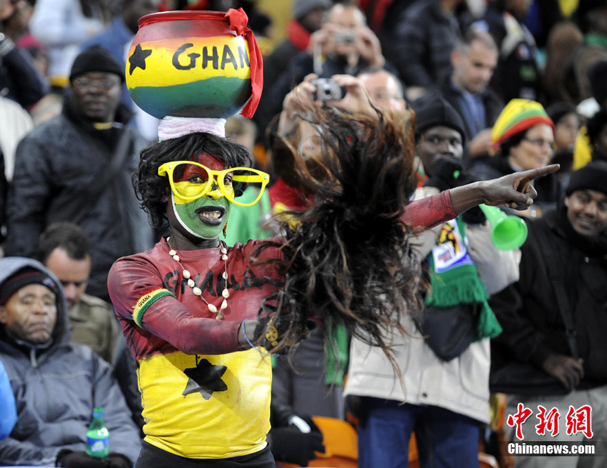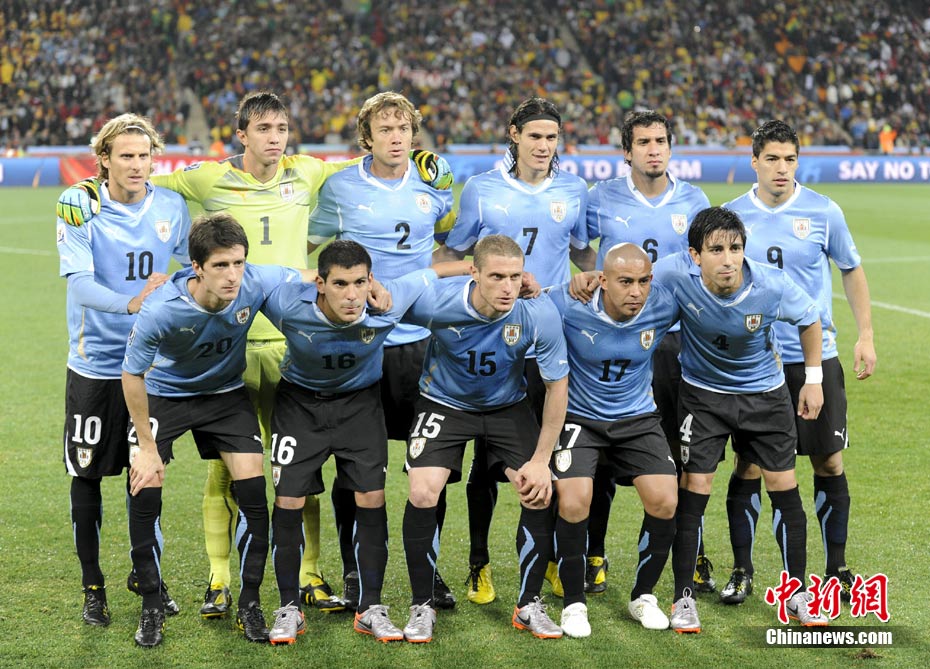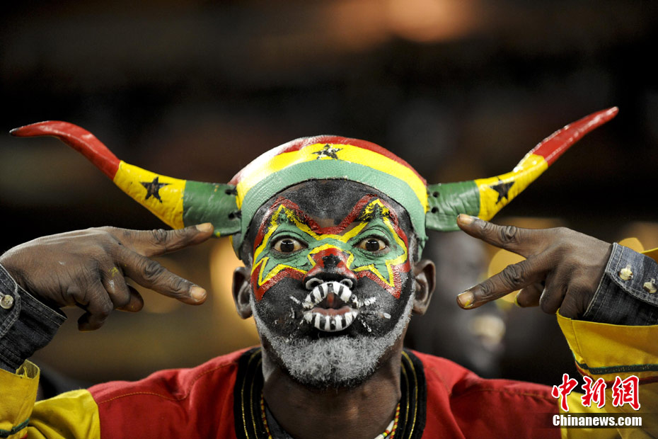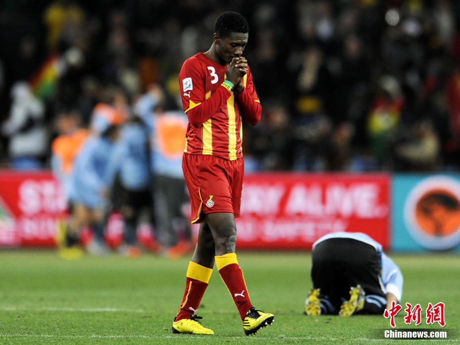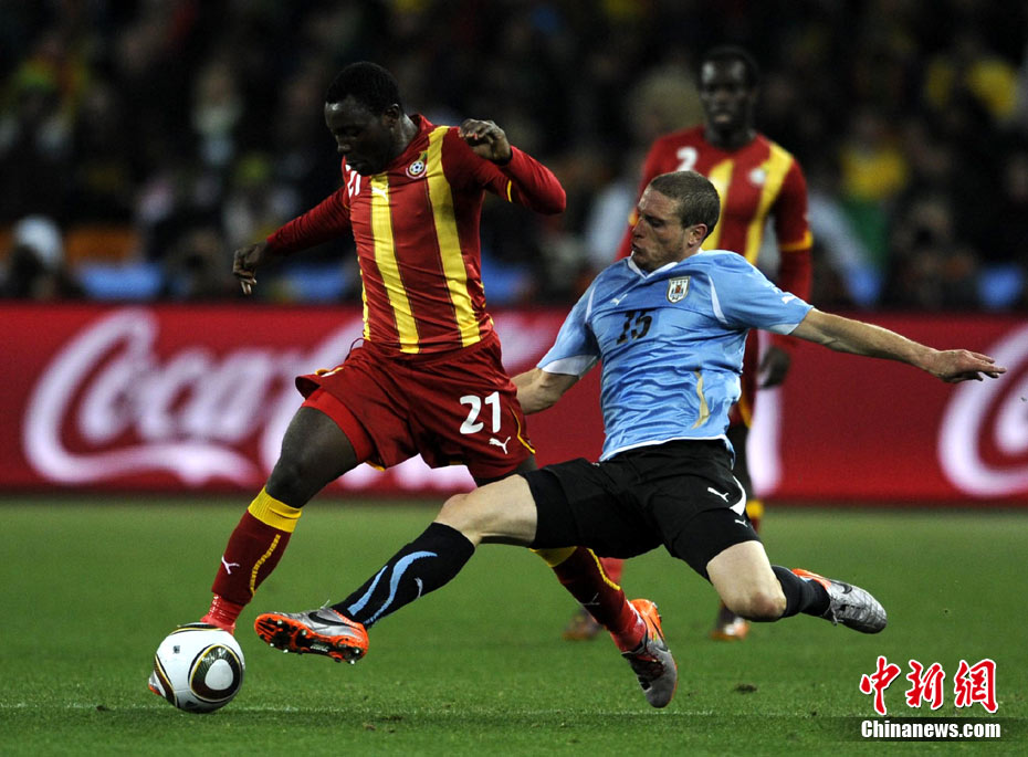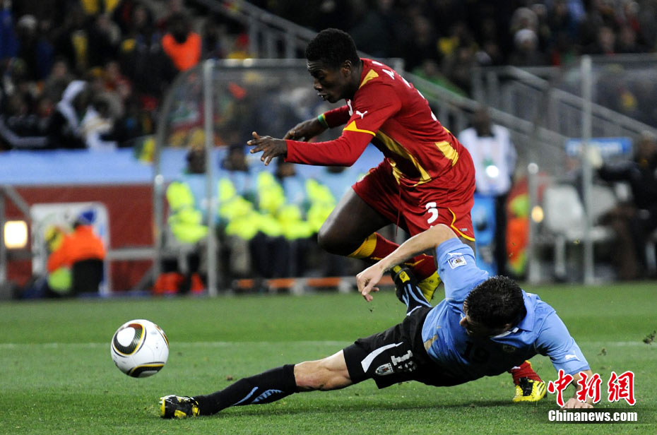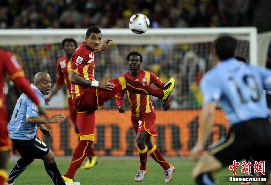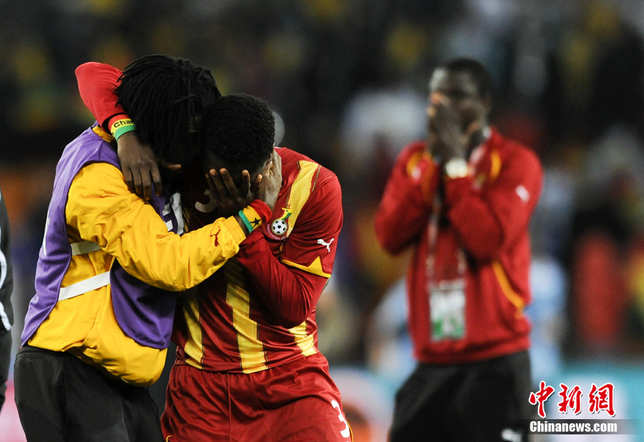 北京时间7月3日凌晨2:30,南非世界杯进行了1/4决赛的第二场争夺,由乌拉圭在约翰内斯堡的足球城球场迎战加纳队。120分钟时间内,双方凭借弗兰和蒙塔里的进球,1-1战成平局。在点球大战中,乌拉圭4-2击败对手,晋级半决赛。 中新社记者 廖攀 摄