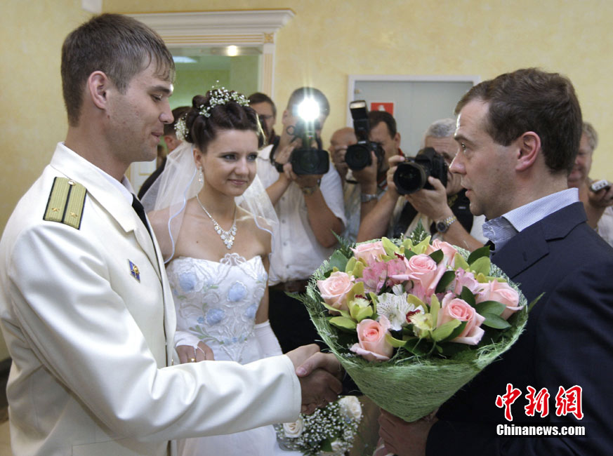 7月1日,俄总统梅德韦杰夫在远东视察时,参观了当地一处婚姻登记处,成为三对新人的婚礼见证人,并给他们送上了非常贵重的礼物。