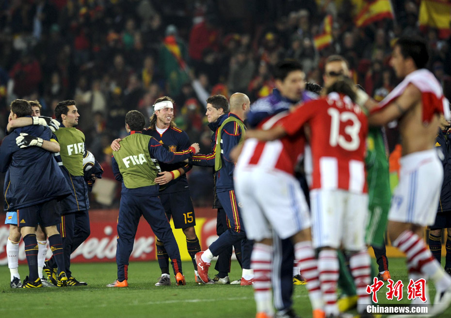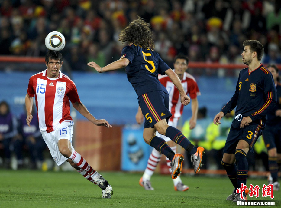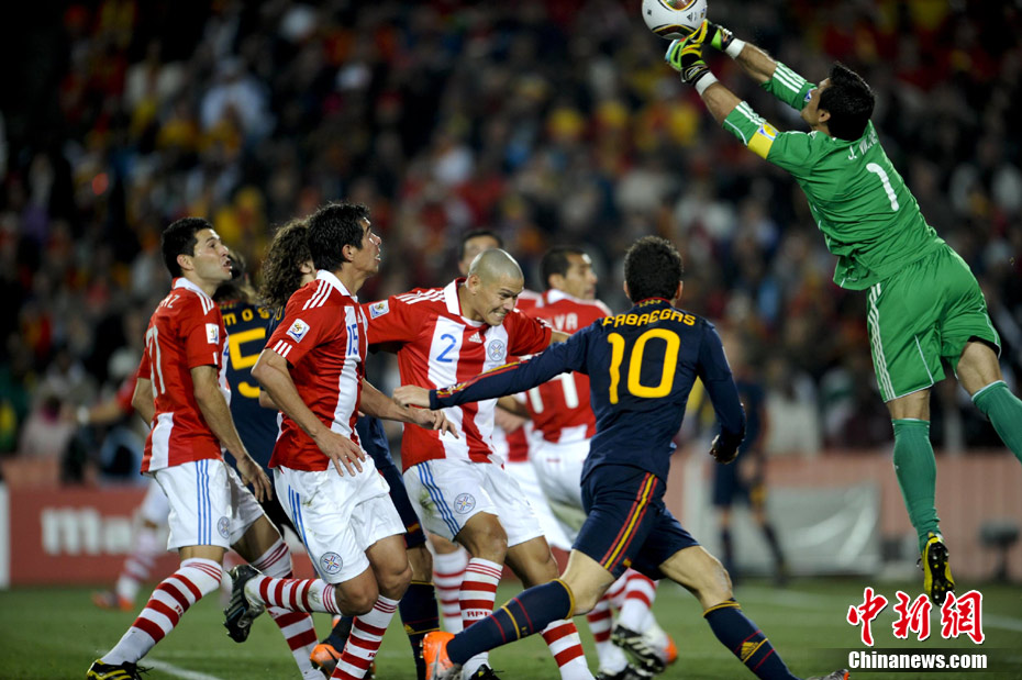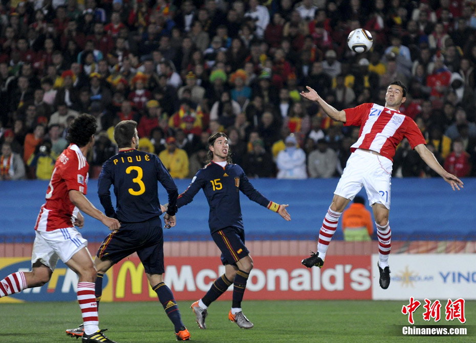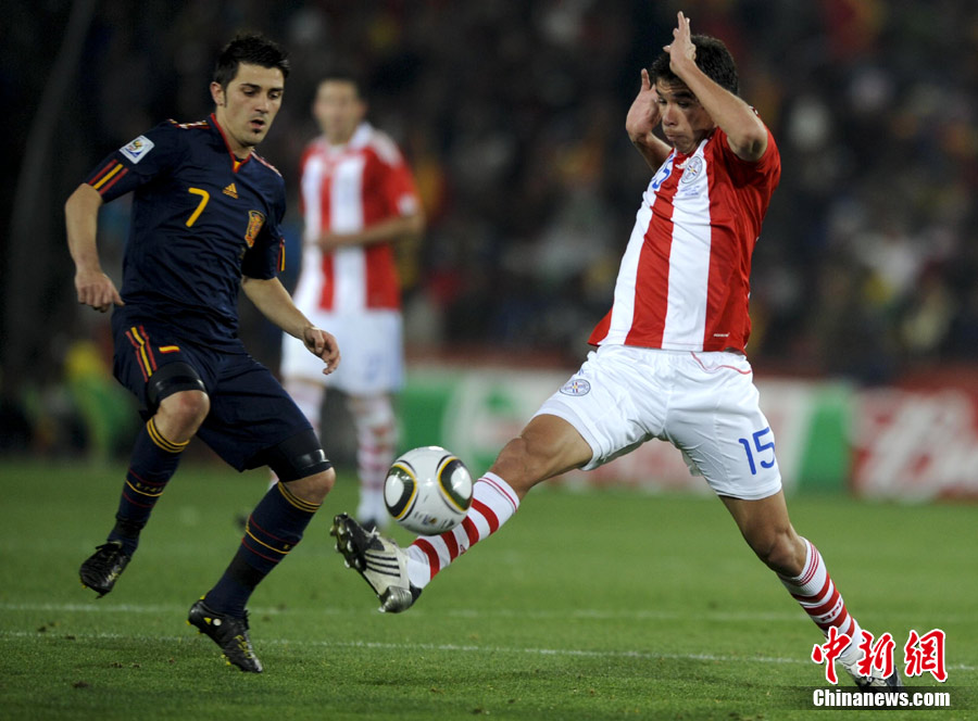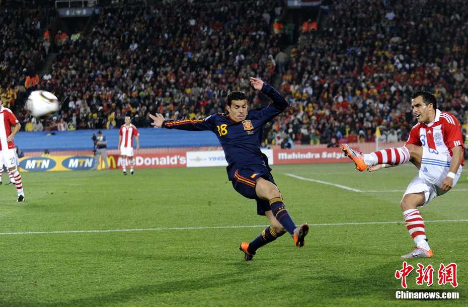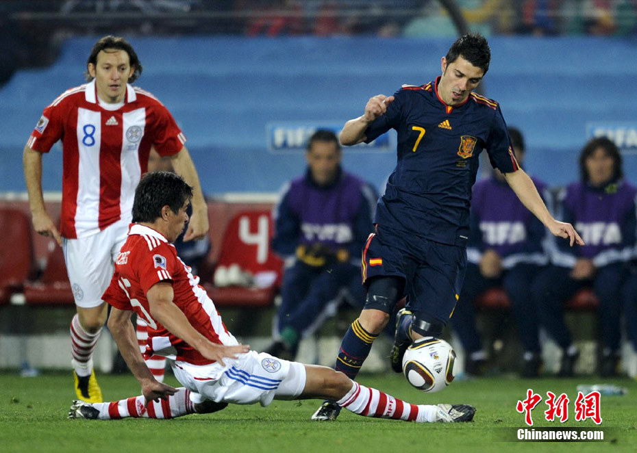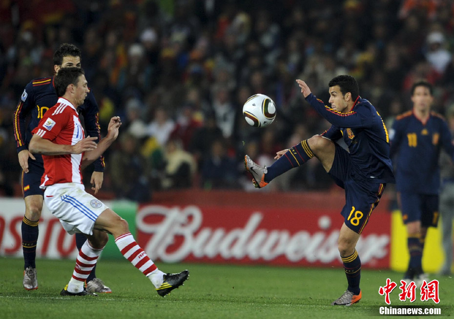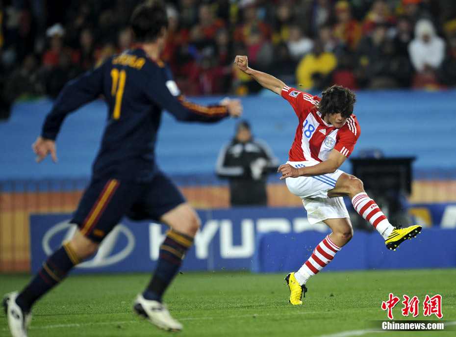 7月4日凌晨,南非世界杯最后一场1/4决赛打响,西班牙在约翰内斯堡的爱丽丝公园球场迎来了南美劲旅巴拉圭队。凭借比利亚在第83分钟的进球,西班牙1-0击败巴拉圭,晋级四强。中新社记者 廖攀 摄