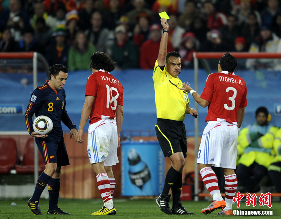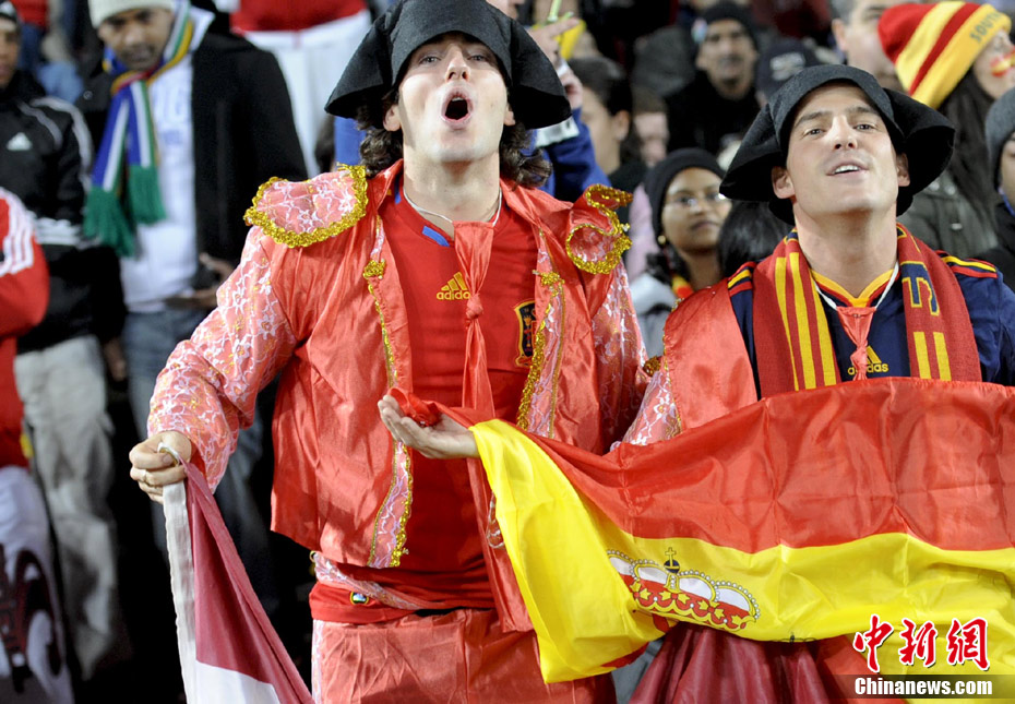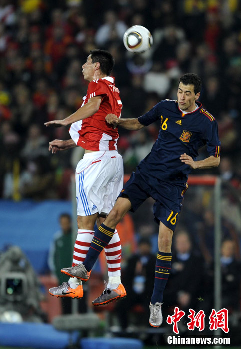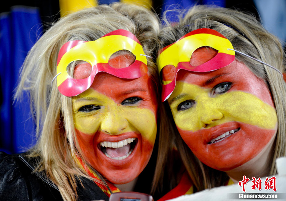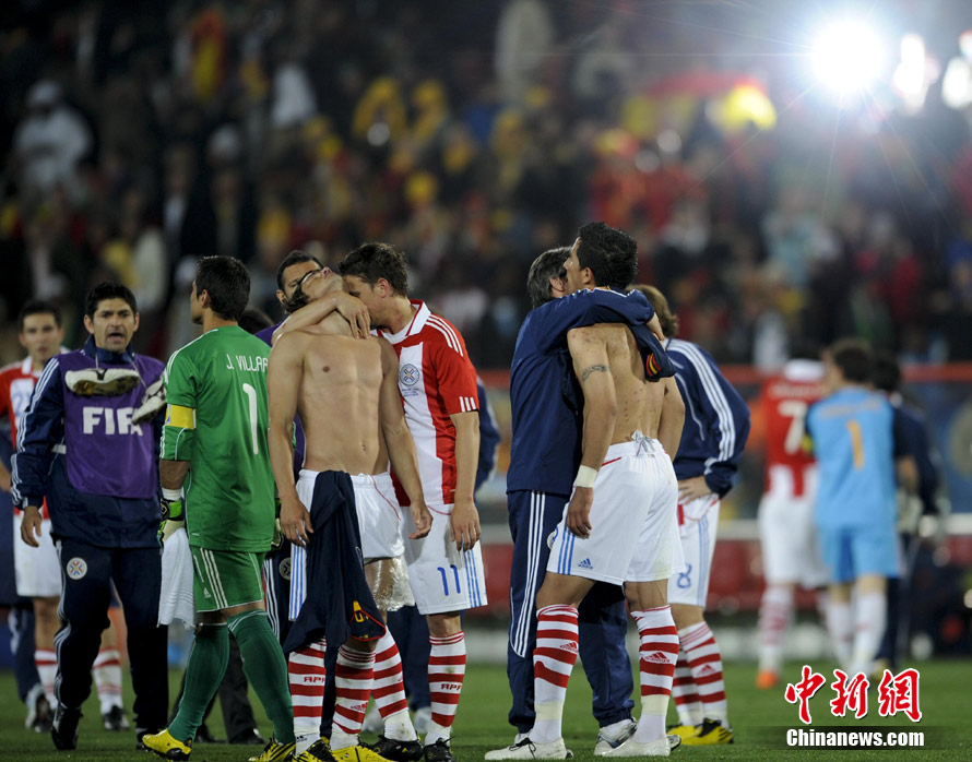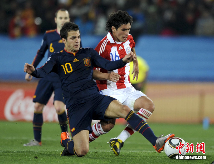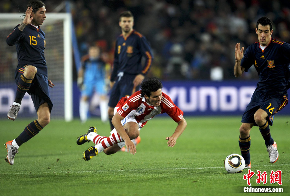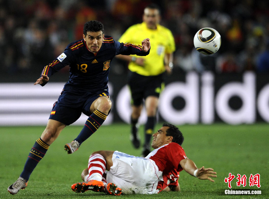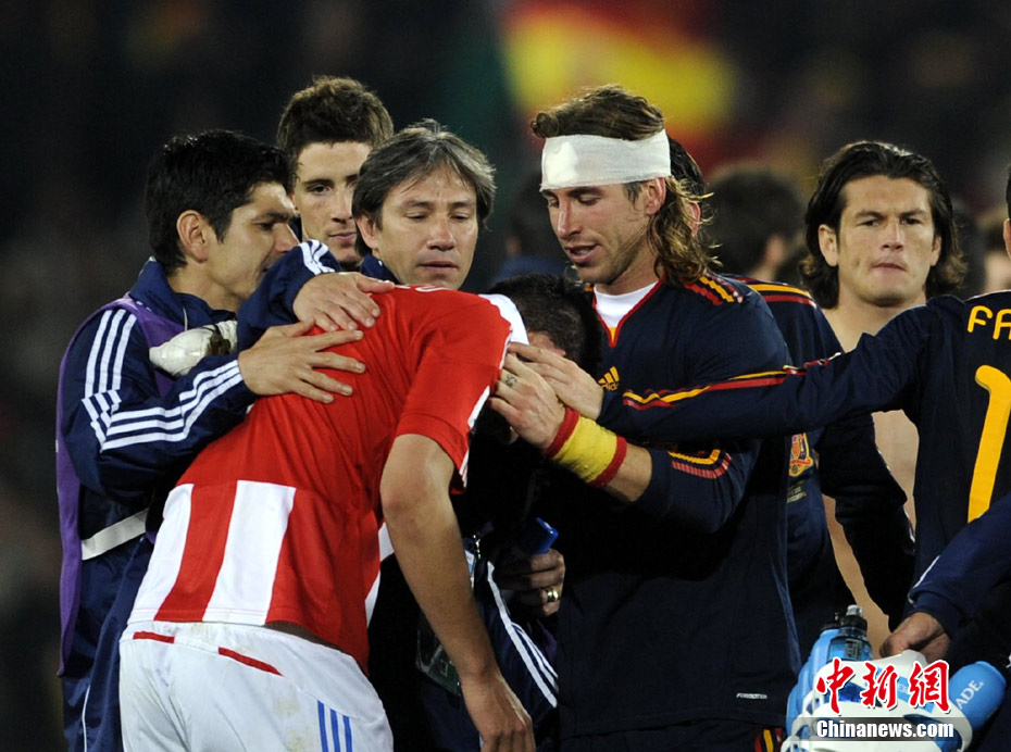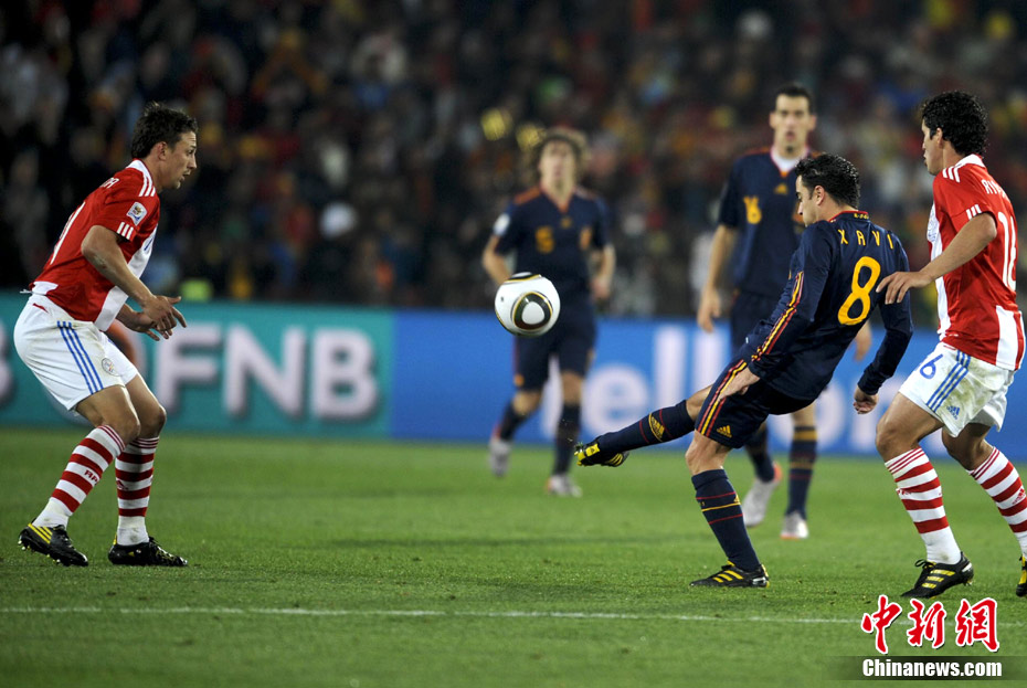 7月4日凌晨,南非世界杯最后一场1/4决赛打响,西班牙在约翰内斯堡的爱丽丝公园球场迎来了南美劲旅巴拉圭队。凭借比利亚在第83分钟的进球,西班牙1-0击败巴拉圭,晋级四强。中新社记者 廖攀 摄