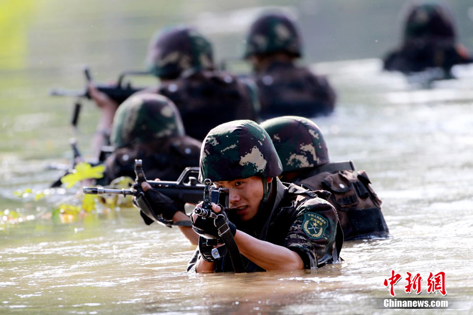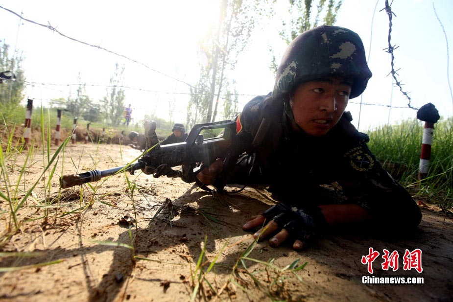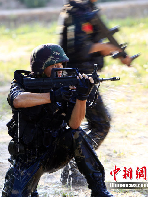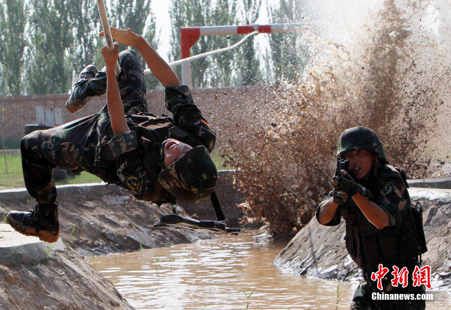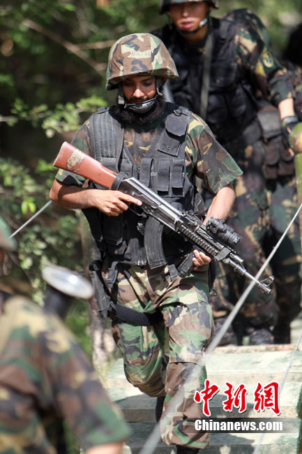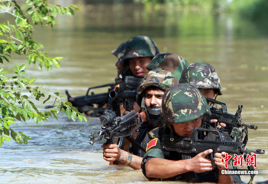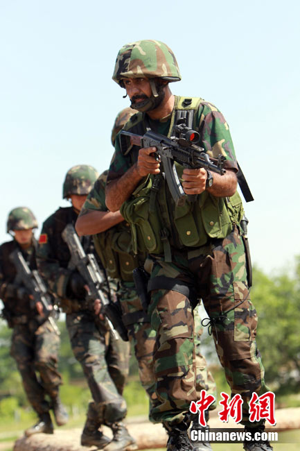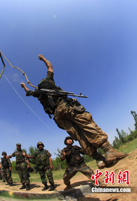 7月5日,中巴两军特战士兵展开高强度魔鬼训练。此次代号为“友谊—2010”的中国巴基斯坦反恐联合训练在中国宁夏青铜峡地区展开,训练主要以边境地区山地联合反恐作战为课题,分为展示交流、混编同训、综合演练三个阶段。 中新社发 杜洋 摄