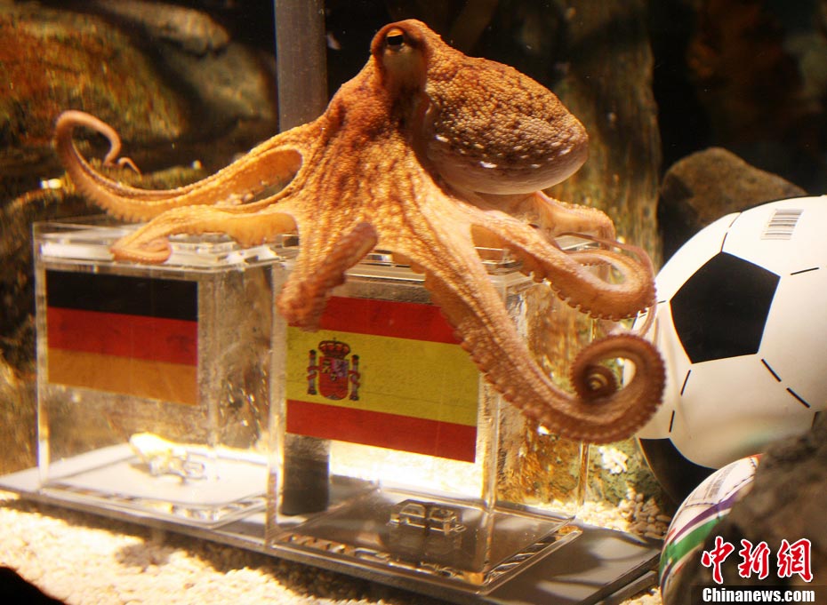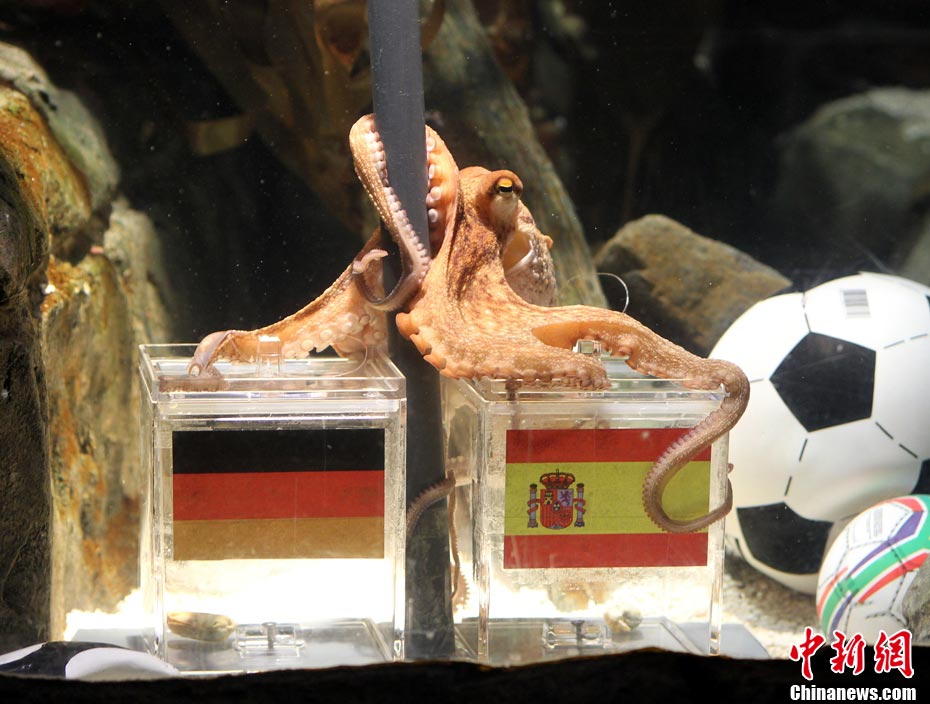7月6日下午,德国某水族馆的章鱼保罗再次出动,对世界杯半决赛德国与西班牙进行了预测,最终他选择了西班牙。保罗认为欧洲冠军西班牙将在半决赛击败势头强劲的德国队进入决赛。《图片报》网站的直播员在公布结果的同时说道:“希望勒夫的小伙子们能扭转局势,拯救这场半决赛。”或许,对于德国球迷来说还有一个自我安慰的理由:保罗在2008年欧锦赛上预测的准确率是80%,并且唯一错的就是决赛与西班牙之战。他们或许已经开始期待:两年后的世界杯预测不要百发百中,至少在半决赛时错一次。