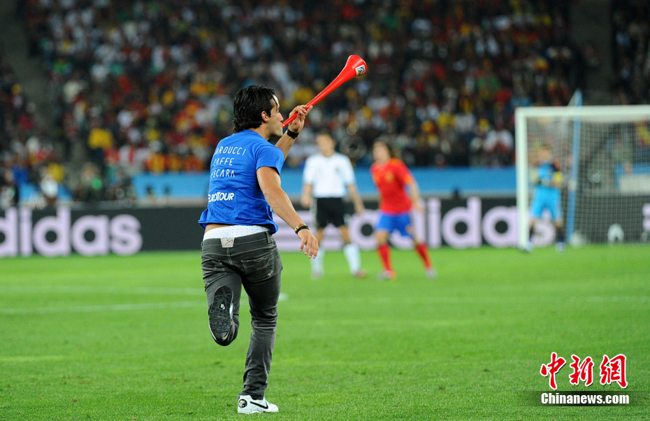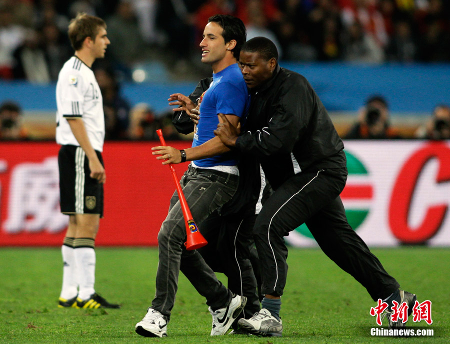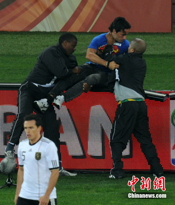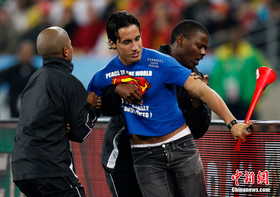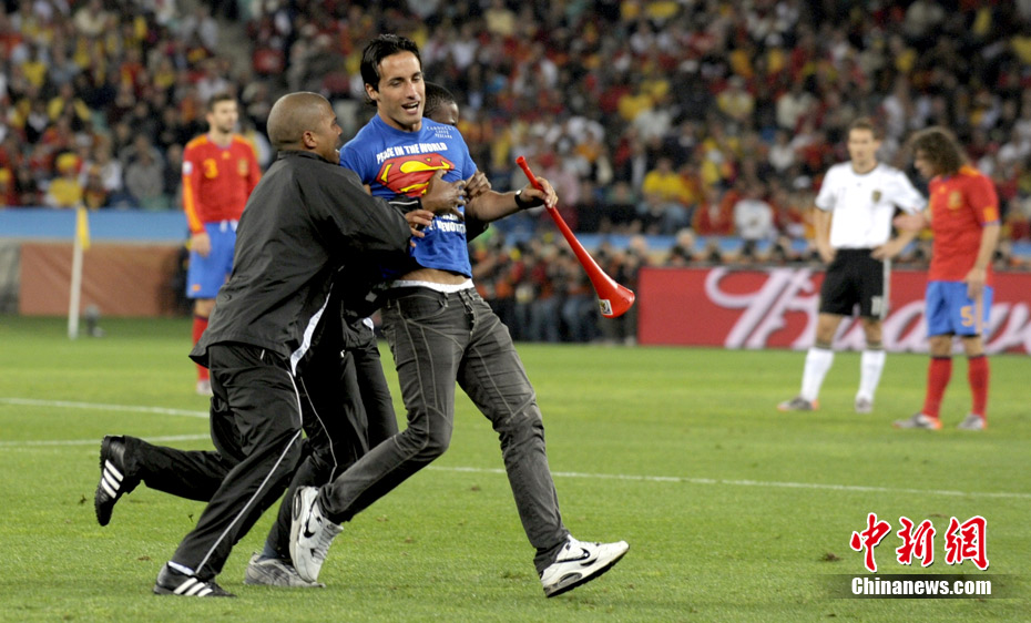 西班牙队和德国队激战正酣时。一名球迷身穿超人背心突然闯进球场,此时双方的比赛短暂地暂停了一会儿,球迷被保安推出了球场。后经有关部门证实,这是一名意大利球迷。