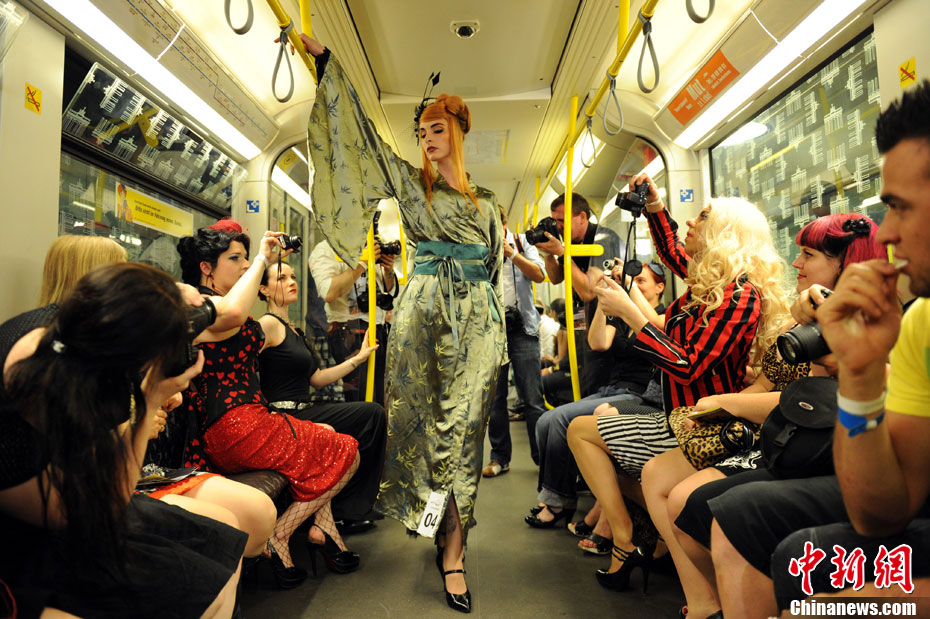 近日,模特穿行在德国柏林行驶的地铁上进行时装表演。这场名为“地铁上的猫步”的时装表演充满朋克和摇滚元素,已经成为每年柏林春夏时装周的一部分。