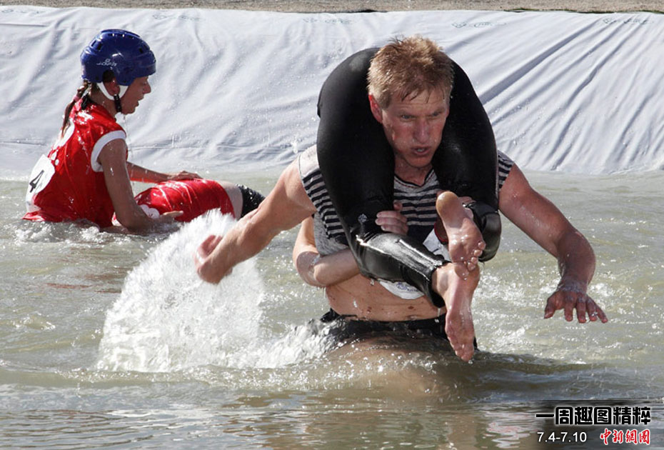 一年的一度的世界背老婆大赛在芬兰中部小镇松卡耶尔维举行,参赛者背着自己的老婆在泳池里行走,最终来自芬兰的一对选手最先通过终点。