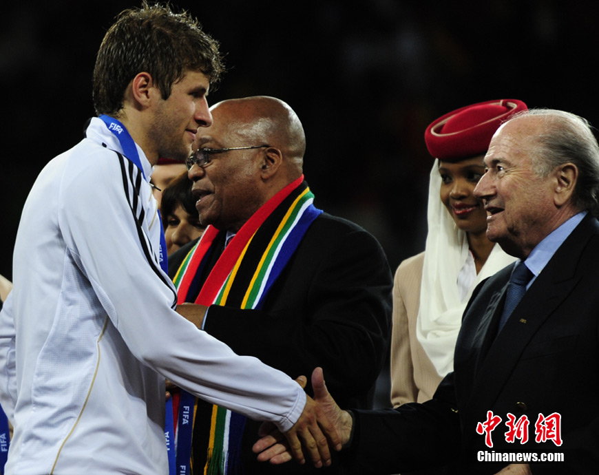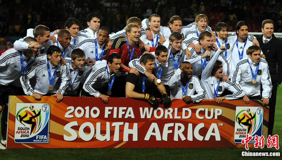 北京时间7月11日凌晨2:30,南非世界杯进行了三四名决赛的争夺战,由乌拉圭在伊丽莎白港的纳尔逊·曼德拉海湾球场迎战德国队。最终在一场进球大战中,德国队凭借第82分钟赫迪拉的进球一锤定音,以3-2险胜对手,获得南非世界杯第三名。