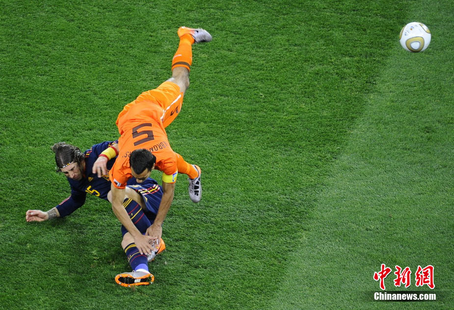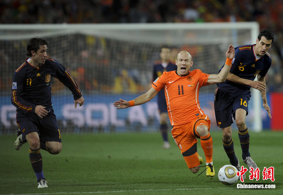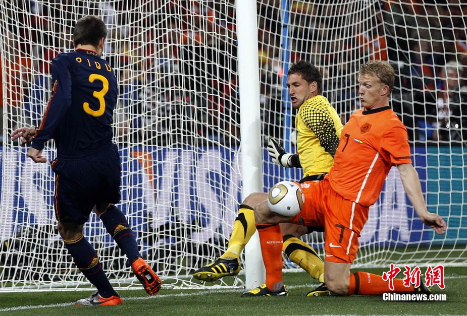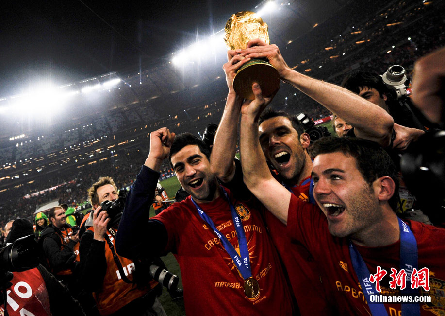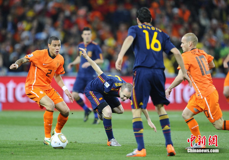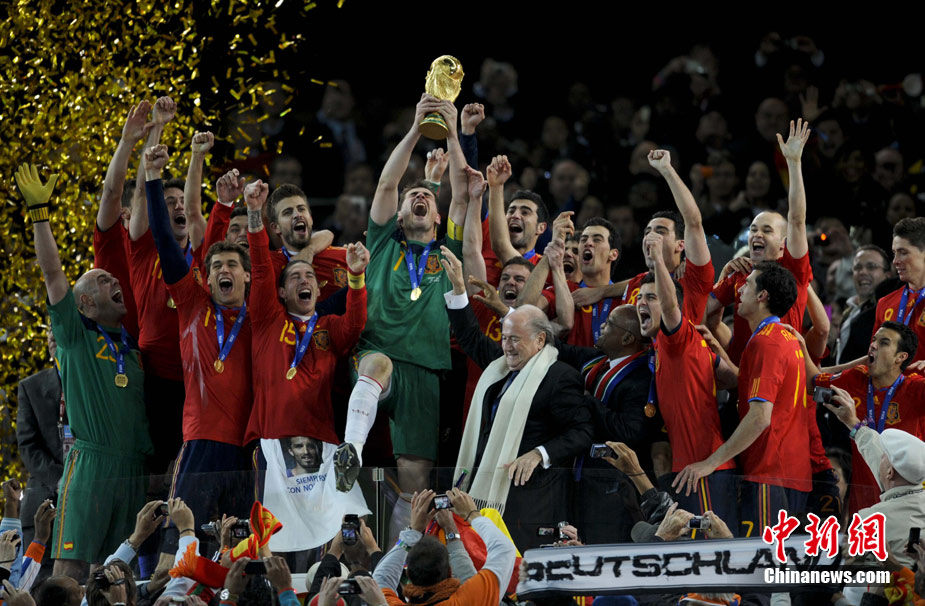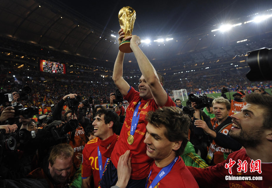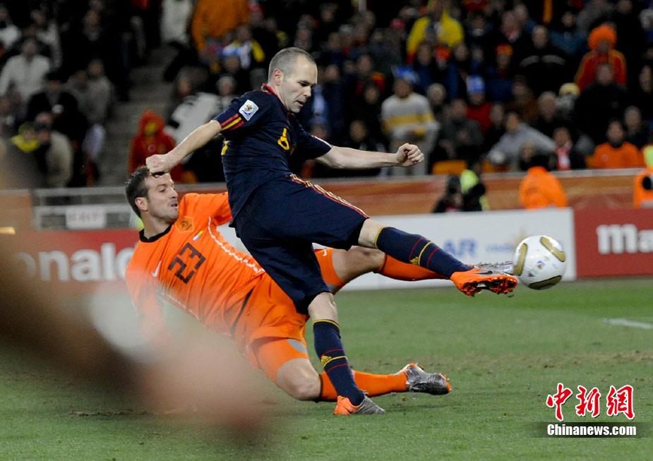 北京时间7月12日凌晨2:30,南非世界杯迎来了最终的决赛,在约翰内斯堡的足球城球场由荷兰队对阵西班牙。最终双方经过120分钟鏖战,伊涅斯塔在第116分钟攻入全场唯一一粒进球,绝杀十人应战的荷兰队,史上首次夺得冠军。