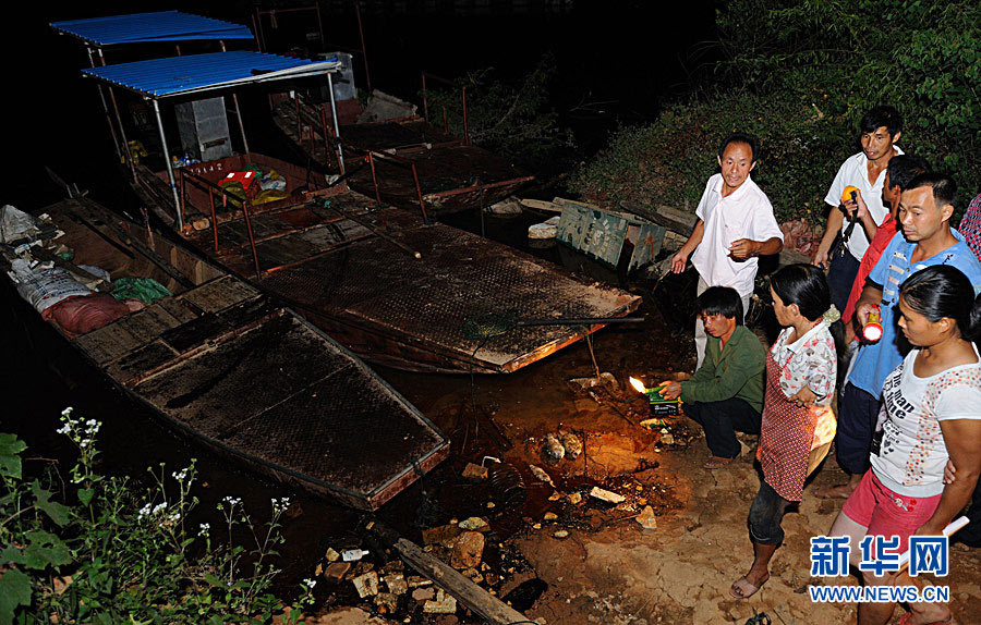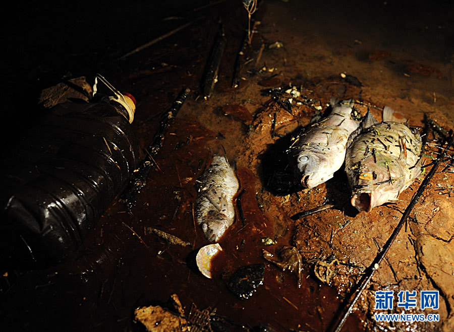 7月12日,位于汀江河下游的棉花滩库区边散落着因水质污染致死的河鱼。